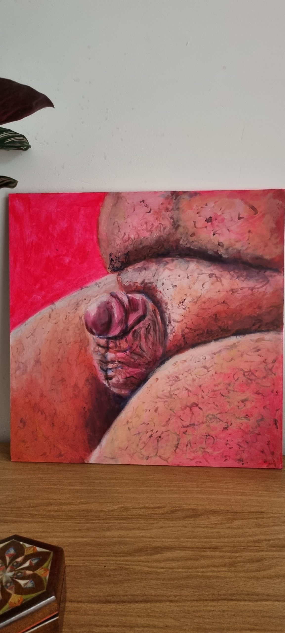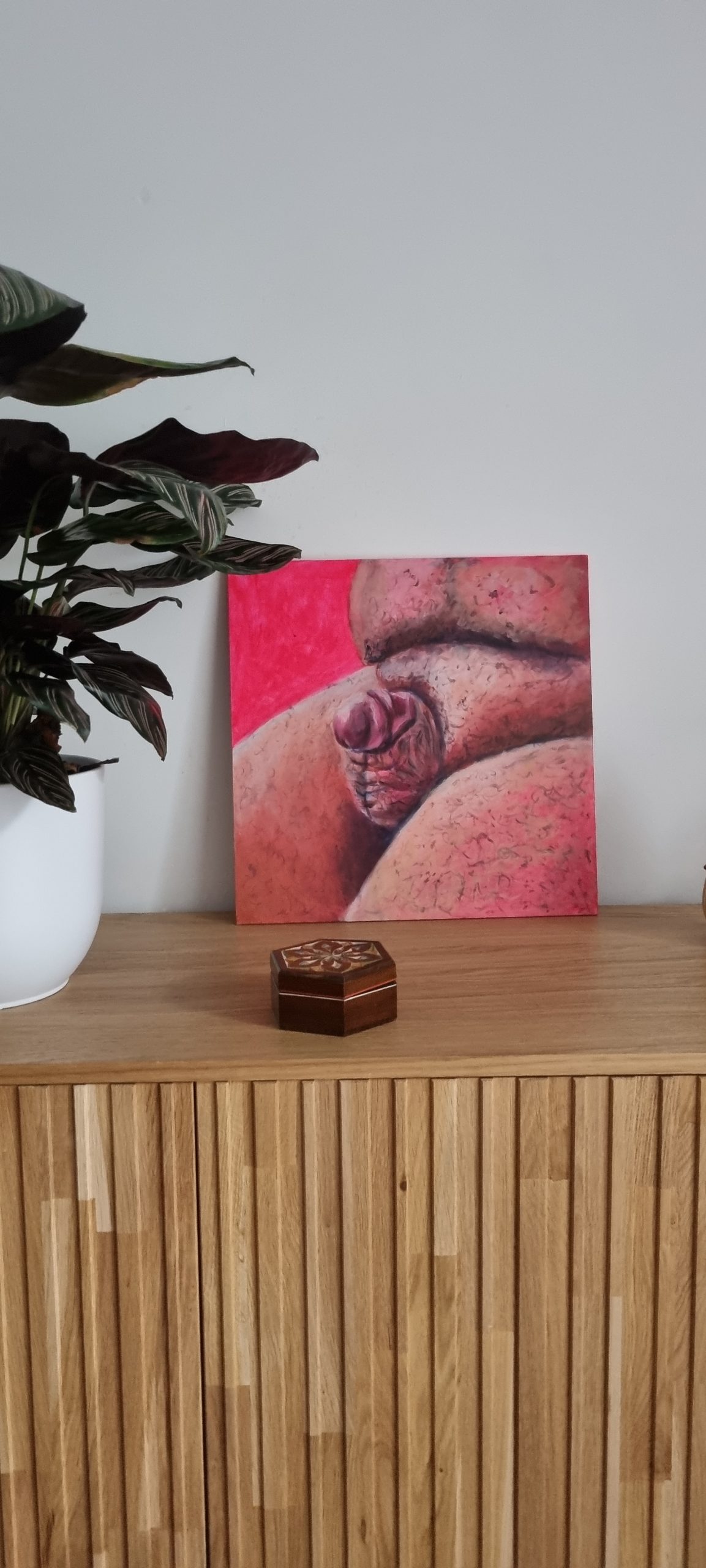 Ik vond een foto van een priester in de kringloop. Daar heb ik deze 18+ afbeelding overheen geschilderd. Alle lichaamstypes verdienen het dat ze zichtbaar zijn in kunst. We verdienen het om ons te herkennen in media.